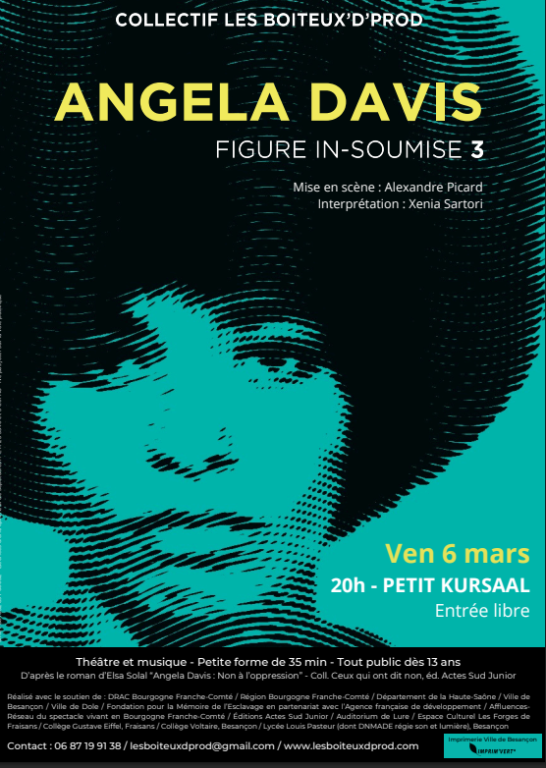 Le collectif Les Boiteux'd'Prod propose ce spectacle de théâtre en musique à 20 h au Petit Kursaal. En 1972, la militante Angela Davis, inculpée de meurtre, d’enlèvement et de conspiration, raconte et témoigne : l’enfance à Birmingham, le racisme, les humiliations qui l'ont conduite à se battre et à défendre la dignité et les libertés individuelles et collectives... Interprétation de Xenia Sartori, mise en scène d'Alexandre Picard adaptée du roman d’Elsa Solal Angela Davis : non à l’oppression.