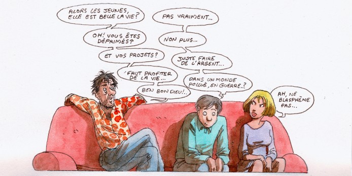 À l’inverse, il est observé un certain désenchantement vis-à-vis du travail (-4 points depuis 1994) et surtout du progrès scientifique (-16 points), qui ne fait plus recette qu'auprès de 44 % des jeunes. Parallèlement, et l’on notera la similarité de proportion, 58 % jugent inacceptable la critique des religions, sachant que c'est dans les rangs des catégories populaires (61 à 65 %), des catholiques pratiquants (76 %) et des musulmans (92 %) que ce refus est le plus fort. Il en découle une influence relative sur les valeurs morales : « Si la jeunesse se montre progressiste sur l'avortement (que 91 % jugent acceptable) et l'homosexualité (73 %), ses valeurs morales apparaissent d’autant plus conservatrices qu’elles sont influencées par la morale religieuse. 49 % des jeunes musulmans et 13 % des jeunes catholiques jugent inacceptables les relations entre personnes de même sexe (vs 7 % des sans-religion) ; 57 % des jeunes musulmans et 31 % des jeunes catholiques estiment inacceptable le changement de genre (vs 21 % des sans-religion). »