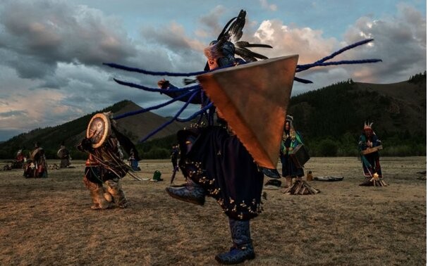 En photo : groupe de chamans en pleine cérémonie, en Sibérie.